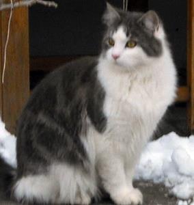 Kater LILLER ist erst 7 Monate alt. Seine Fellgrundfarbe ist weiß mit dunkelgrauen getigerten Flecken und einem getigerten Schwanz. LILLER ist Freigänger. Er ist Fremden gegenüber eher scheu und versteckt sich gerne.