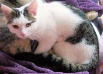 Kater PASCHE ist erst 10 Wochen alt. Sein Fell ist weiß mit grau getigerten Flecken und grauem Fleck auf der Nase. PASCHE war 2 Wochen in der Wohnung und vorher auf einem Bauernhof zuhause. Er ist Fremden gegenüber zunächst scheu, dann interessiert.