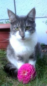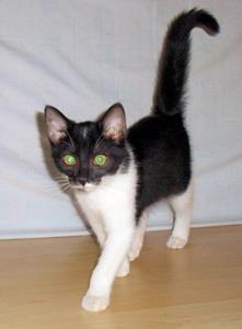 Kater MUCKEL ist 7 Jahre alt. Sein Fell ist schwarz/weiß. Besonderes Erkennungszeichen: Er hat auf der Innenseite der linken Vorderpfote oberhalb des Ballens einen kreisrunden schwarzen Fleck. MUCKEL ist Freigänger. Er ist sehr zutraulich und läßt sich auch von Fremden streicheln.