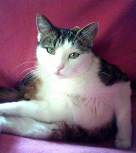 WILMA ist 10-14 Jahre alt. Sie hat ein weißes Fell mit grau-braun getigertem Rücken und Schwanz. Besonderes Merkmal: Sie hat einen dunklen Fleck auf der Nase. WILMA ist nicht sehr zutraulich und läßt sich nicht hochnehmen.