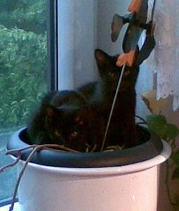 Yang ist 3,5 Monate alt und hat ein ganz schwarzes Fell. Das Geschlecht der Katze wurde noch nicht festgestellt.