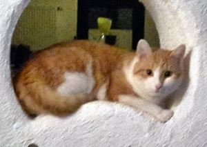 CLEO ist 10 Jahre alt. Sie hat ein rot getigertes Fell mit weißer Brust, Bauch und Pfoten. Auffällig ist die rote Zeichnung um ihre Nase. CLEO ist Freigängerin und Fremden gegenüber sehr scheu.
