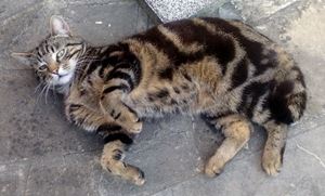 Kater BRUCE ist 2 Jahre alt. Er hat ein braun-beige getigertes Fell mit weißer Schnauze und Schnurrhaaren und einer markanten Zeichnung auf der Stirn. Sein Bauch hat ein Leopardenmuster und seine Pfotenunterseiten sind schwarz. BRUCE ist Freigänger und Fremden gegenüber eher zutraulich.