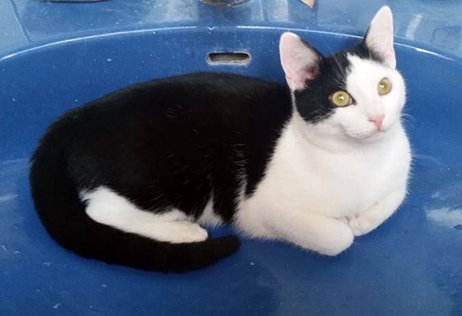 Kater MILO ist 1,5 Jahre alt. Er hat ein schwarz-weißes Fell mit weißen Pfoten sowie einem kleinen schwarzen Fleck auf der Nasenspitze. MILO ist Freigänger und Fremden gegenüber sehr zutraulich.