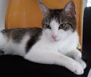 SPOT ist ca. 2,5 Jahre alt und klein. Sie hat eine weiße Fellgrundfarbe mit dreifarbigen Flecken an den Ohren und Hinterkopf sowie einem mehrfarbigen Schwanz mit weißer Schwanzspitze. SPOT ist Freigängerin und Fremden gegenüber sehr zutraulich. Möglicherweise ist sie in einem Auto mitgefahren.