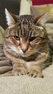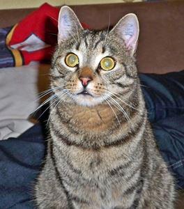 Kater TONI ist 1,5 Jahre alt. Er hat ein braun getigertes Fell mit weißem Kinn. TONI ist Freigänger und auch Fremden gegenüber relativ zutraulich.