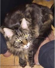 Kater ROCKY ist 1,5 Jahre alt. Er hat ein grau/braun getigertes langes Fell mit weißer Schnauze. ROCKY ist Freigänger und Fremden gegenüber eher zutraulich.