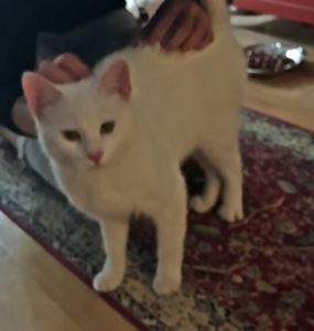 Kater MERLIN ist ca. 1 Jahr alt. Er hat ein komplett weißes Fell und gelbe Augen. Er ist normalerweise Freigänger und Fremden gegenüber sehr zutraulich.