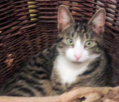 BLUE ist 1 Jahr alt. Sie ist sehr zierlich und hat ein schmales Gesicht. Ihr Fell ist braun getigert Fell mit weiß. Sie hat eine dunkle Nase. BLUE ist Freigängerin.