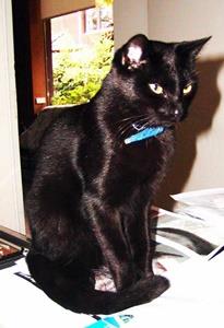 Kater JERRY ist 2 1/2 Jahre alt. Er hat ein schwarzes Fell mit ein paar weißen Strichelhaaren auf der Brust. Er trug ein blaues Halsband mit Schnappverschluß (also nicht wie auf dem Foto, ein überhängendes Bändchen) und einem blauem Glöckchen.