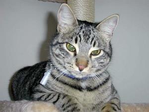 Kater HERKULES ist ca. 10 Monate alt. Er ist grau-schwarz getigert, hat grau-grüne Augen und einen sehr langen Schwanz. Er ist sehr zutraulich.