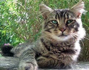 Kater SIMBA ist 1 Jahr alt und ein Maine-Coon-Mix. Er hat ein grau getigertes Fell mit hell umrandeten Augen und heller Schnauze. Sein Schwanz ist getigert mit schwarzer Schwanzspitze. SIMBA ist Freigänger und Fremden gegenüber sehr zutraulich.