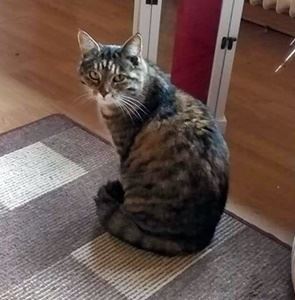 SUSI ist 13 Jahre alt. Sie hat ein grau getigertes Fell mit wenigen roten Stellen sowie einem weißem Schnauzen/Kinnbereich. SUSI ist Freigängerin und Fremden gegenüber sehr scheu und ängstlich. Bei ihrem Verschwinden trug sie ein Floh-/Zeckenhalsband.